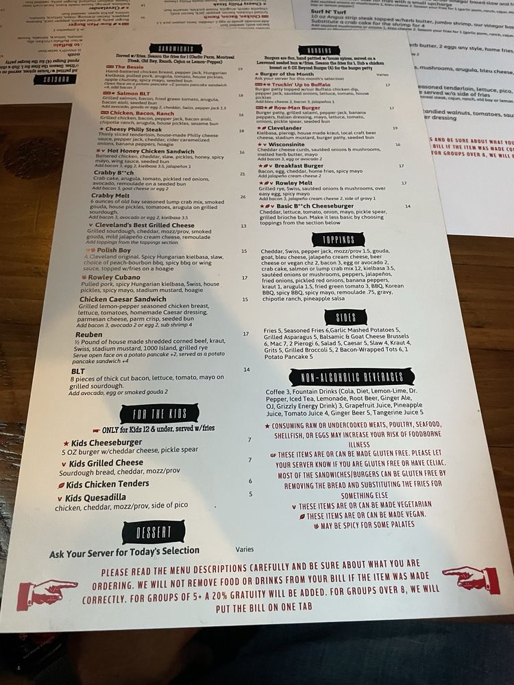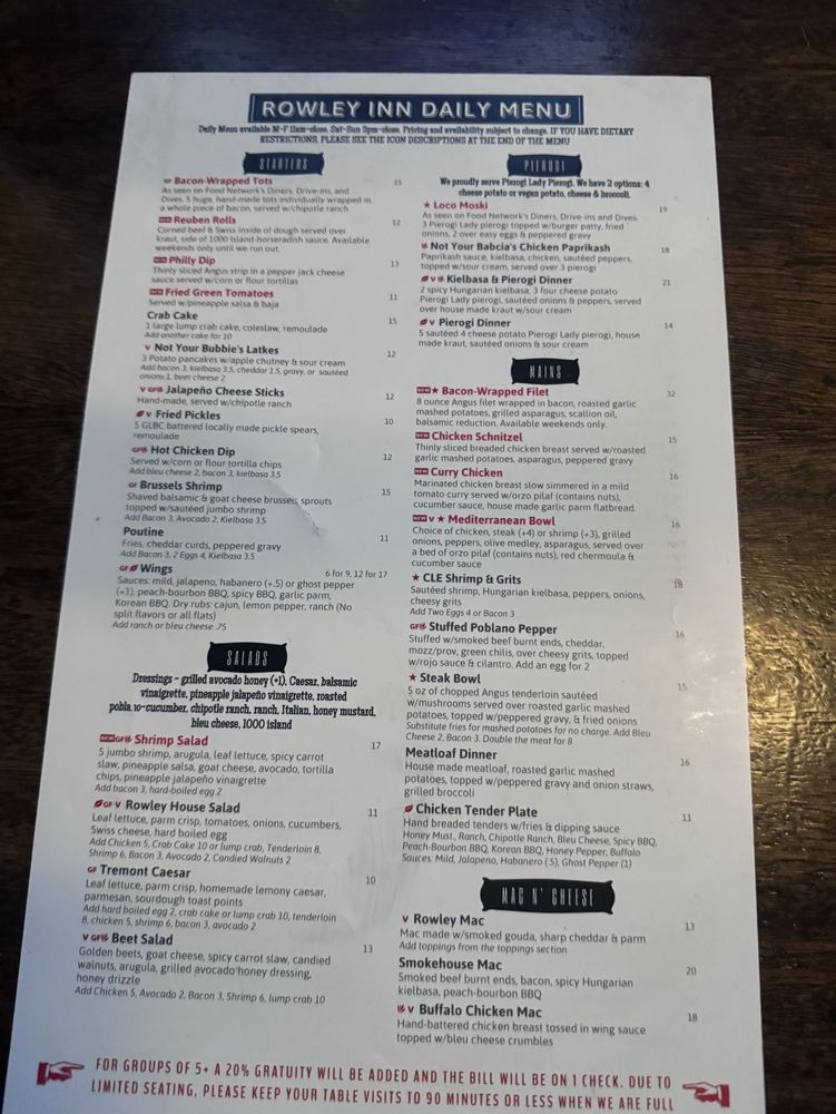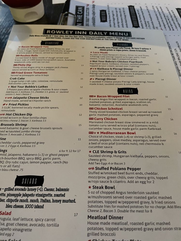 Located in Cleveland, Ohio, Rowley Inn is a gastropub with a rich history dating back to 1906. Offering a range of dishes from starters like Brussel Shrimp Balsamic to mains like Chicken Paprikash, the menu caters to a variety of tastes. The cozy yet lively atmosphere makes it a perfect spot to unwind and enjoy a meal. Customers rave about the delicious food, with standout dishes like the shrimp and grits receiving high praise. The friendly service and accommodating staff enhance the overall dining experience. With a diverse selection of vegan and vegetarian options, Rowley Inn caters to a wide range of dietary preferences. Whether you're looking for a casual meal or a place to relax with friends, Rowley Inn offers a welcoming environment with great food and drinks.